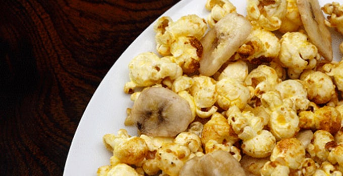 Quickly open lid and pour banana mixture over hot popcorn; then close lid and continue stirring (no heat) until throughly mixed. Pour into large bowl. Add about 1/4 cup of dried banana chips to the bowl. Lightly mix. Cool and store in an airtight container. Makes about six servings.