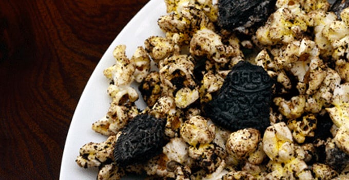 Prepare the cookie crumbs. You can use the food processor, or you may break up the cookies by putting them in a sturdy bag and rolling them with a rolling pin. Mix cookie crumbs with cocoa and salt in a small bowl. Have cookie mixture ready next to popper, close to stove. Have bowl ready to put popcorn in.